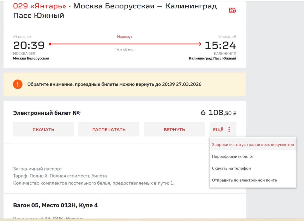Отслеживать статус транзитных документов нужно самостоятельно. Уже через несколько часов можно зайти в личный кабинет пассажира на ticket.rzd.ru — выбрать нужный заказ и зайти в него. Там, где написано электронный билет, зайти во вкладку «Еще» и нажать «Запросить статус транзитных документов».